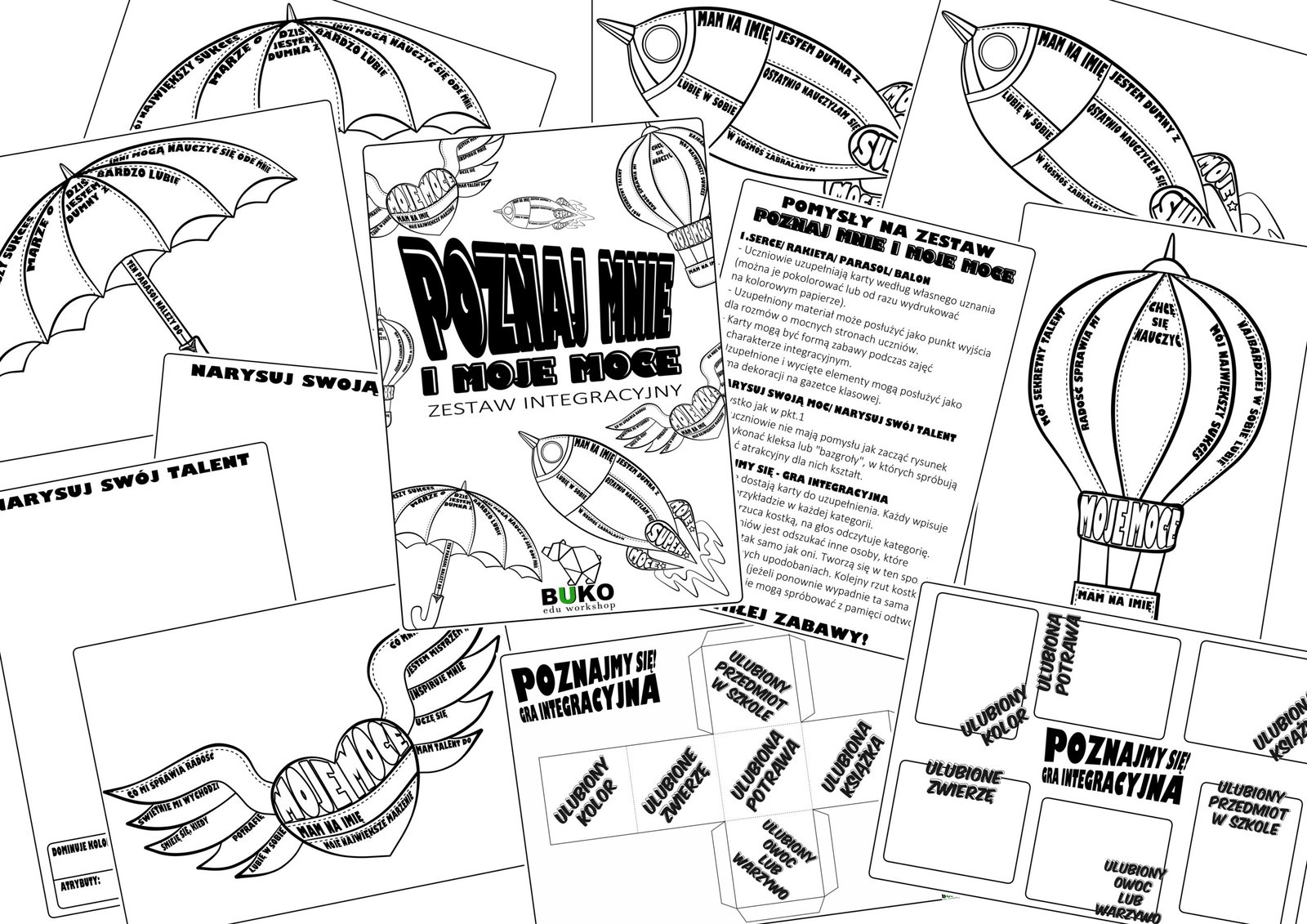 – Karty MOJE MOCE, które uczniowie mogą uzupełniać, takie jak serce, 2x rakieta, 2x parasol i balon;